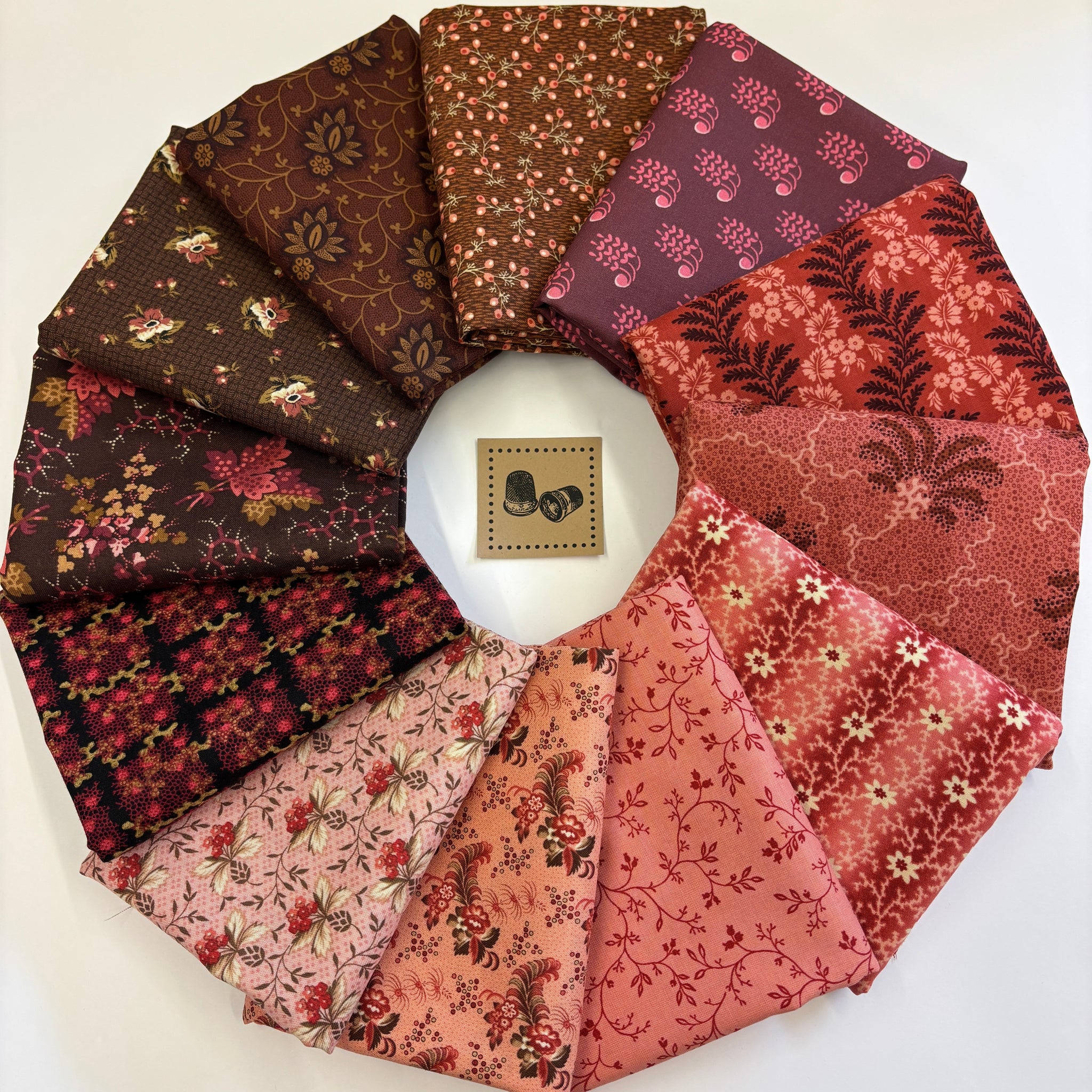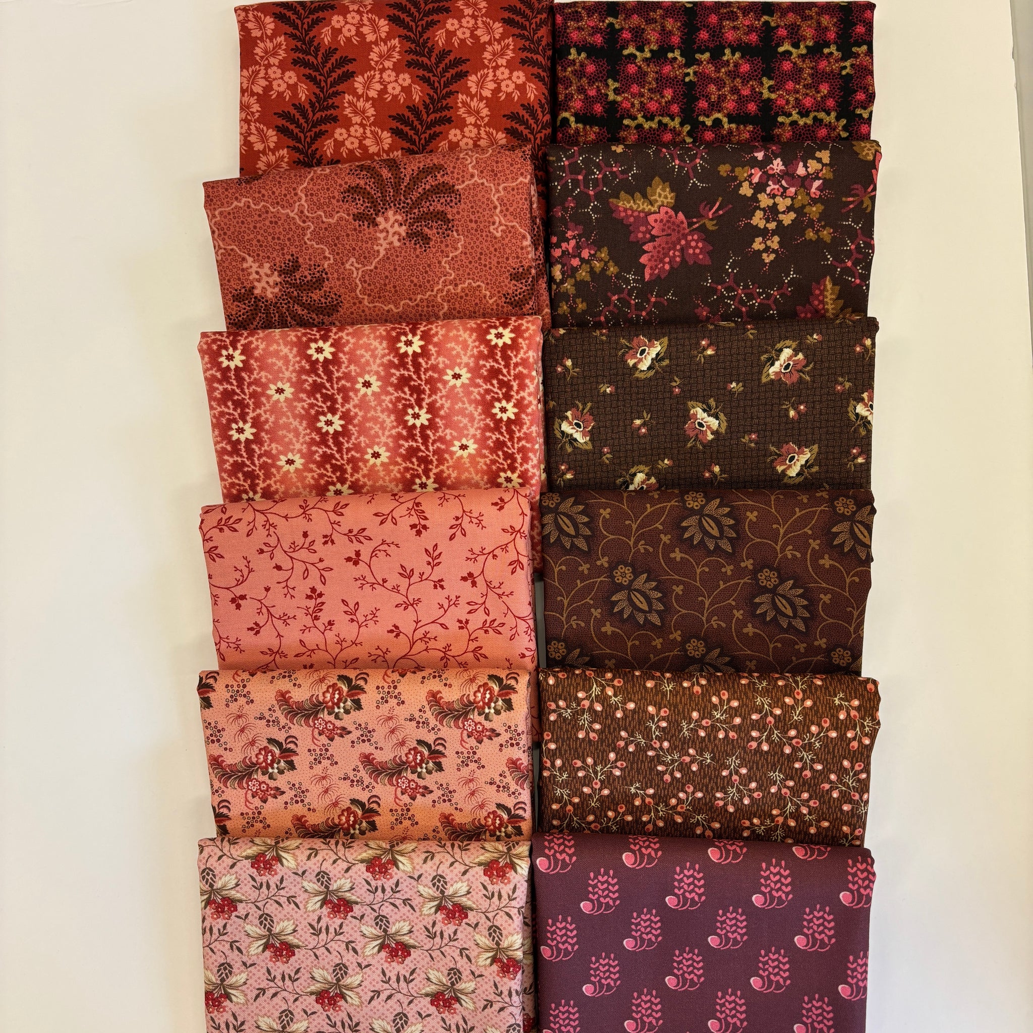 A bundle of favorites in a range of pink, coral, rosy reds and brown.  12 fat quarters, each fat quarter is 18 x 22 approx. a total of 3 yards.
